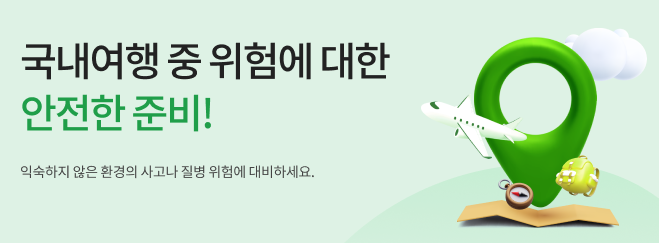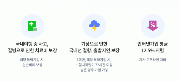 국내여행 중 사고, 질병으로 인한 치료비 보장 해당 특약가입 시, 실손비례 보상 기상으로 인한 국내선 결항, 출발지연 보장 1회한, 해당 특약가입 시,보험시작일이 72시간 이상 남은 경우 가입