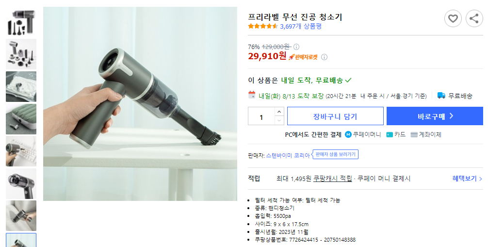 사용 후기: 처음 프리라벨 청소기를 사용했을 때, 강력한 흡입력에 놀랐습니다. 차 안에 흘린 과자 부스러기나 머리카락을 순식간에 빨아들여 정말 만족스러웠습니다. 배터리도 오래 가서 한 번 충전으로 차량 전체를 청소할 수 있어 편리했습니다. 다만, 장시간 사용하면 손목이 조금 피로해져서, 무게에 민감한 분들은 사용 전 고려해보셔야 할 것 같습니다.