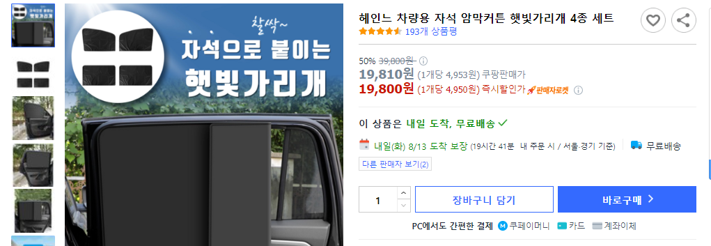 사용 후기: 헤인느 차량용 자석 암막커튼은 매우 만족스러운 제품이었습니다. 특히 강한 자석 덕분에 커튼이 고정되어 운전 중에도 안정적으로 사용할 수 있었습니다. 암막 커튼이라 햇빛을 거의 완벽하게 차단해 장거리 운전 시 눈부심이 전혀 없었고, 가족들이 차 안에서 편하게 쉴 수 있었습니다. 다만, 초기 설치 시 자석 위치를 잘 맞추는 것이 중요하며, 가격이 조금 비싼 편이라 세트 구매를 고려하시는 분들은 예산을 잘 계획하셔야 할 것 같습니다.